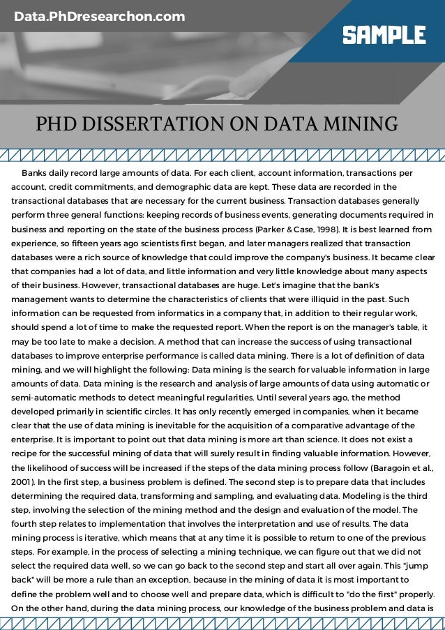 I was at the edge of my doctorate graduation since my thesis is totally unconnected chapters. You people did a magic and I get my complete thesis!!! Good family environment with collaboration, and lot of hardworking team who actually share their knowledge by offering PhD Services. I enjoyed huge when working with PhD services, phd thesis data mining. I was asked several questions about my system development and I had wondered of smooth, dedication and caring. Thank you! I was read my entire research proposal and I liked concept suits for my research issues.